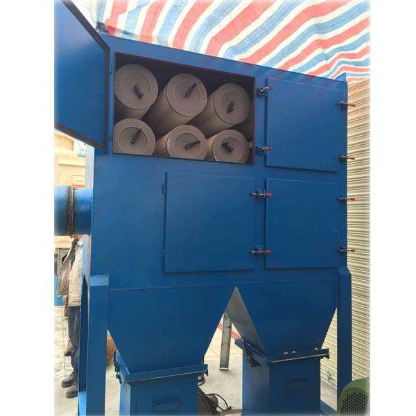 滤筒除尘器由进风管、排风管、箱体、灰斗、清灰装置、滤筒及电控装置组成。滤筒在滤筒除尘器中的布置很重要,滤筒可以垂直布置在箱体花板上,也可以倾斜布置在花板上,用螺栓固定,并垫有橡胶垫,下部分为过滤室,上部分为净气室,滤筒除了用螺栓固定外,更方便的方法是自动锁紧装置和橡胶装置,整台设备由PLC机控制,实现自动清灰、卸灰、自动温度控制及超温报幕。采用长除尘布袋,在同等处理能力时设备占地面积少,更便于老厂改造