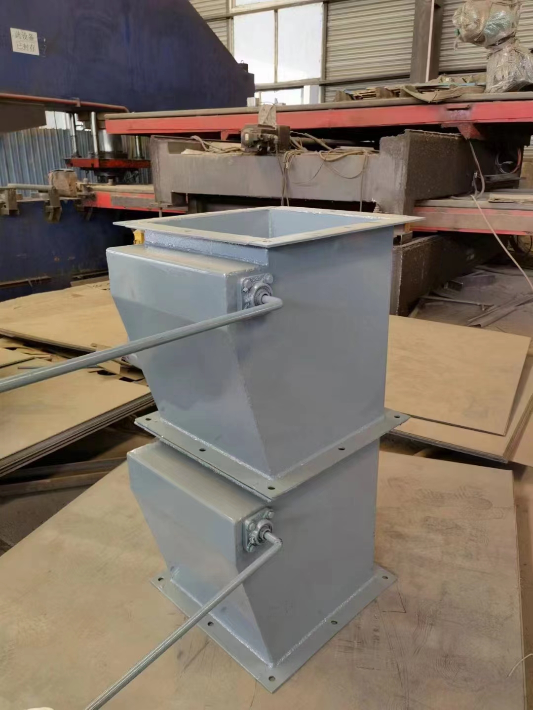 双层重锤翻板阀的阀板在物料重力作用下自动开启,物料下落后,配重杠杆系统使阀板自动复位,防止野风吹入,从而完成物料的输送。